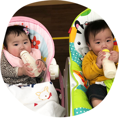 出席確認をしたあと、朝のおやつをいただきます! 0歳児の園児は授乳のあと午前寝をします。