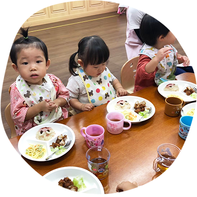 当園ではアレルギーなどに対応した園内調理を行っています。 お子さんの成長に大切な栄養バランスを考えた献立をご用意いたします。 みんなで食べることで食事のマナーも身についていきます。